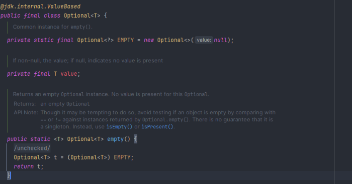 • NPE는 회피 가능하지만 실제 값에 대한 보증은 하지 않기 때문에 NoSuchElementException 가능성
